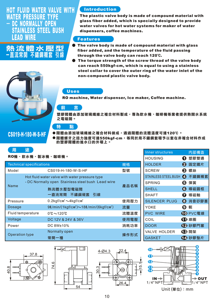 塑膠閥體由添加玻璃纖維之複合材料製成,專為飲水機、咖啡機等業者提供熱開水系統之電磁閥。 |